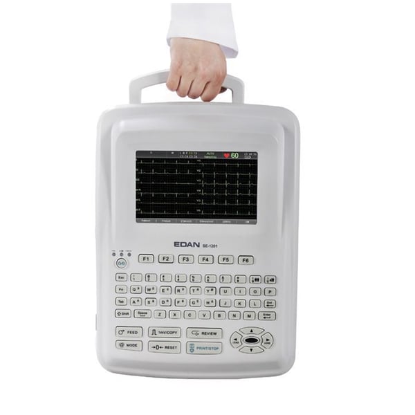 He EDAN SE 1201 12-track ECG is a 12-channel automatic, manual, RR rhythm or memory electrocardiograph , with a 7" color screen that allows simultaneous capture and display of 12 channels, with 6 speeds and 5 sensitivities.