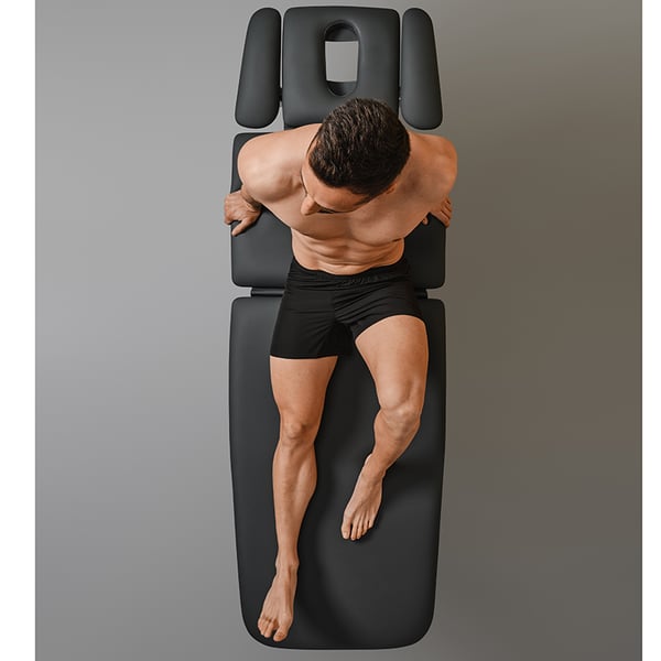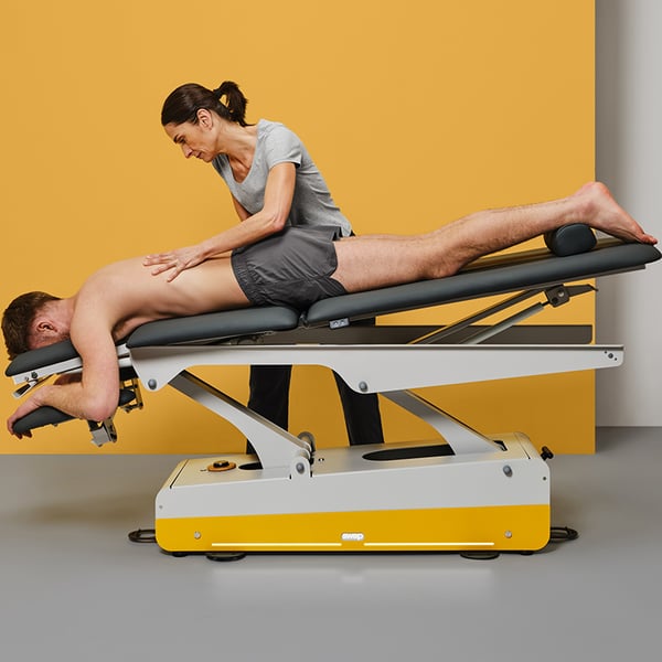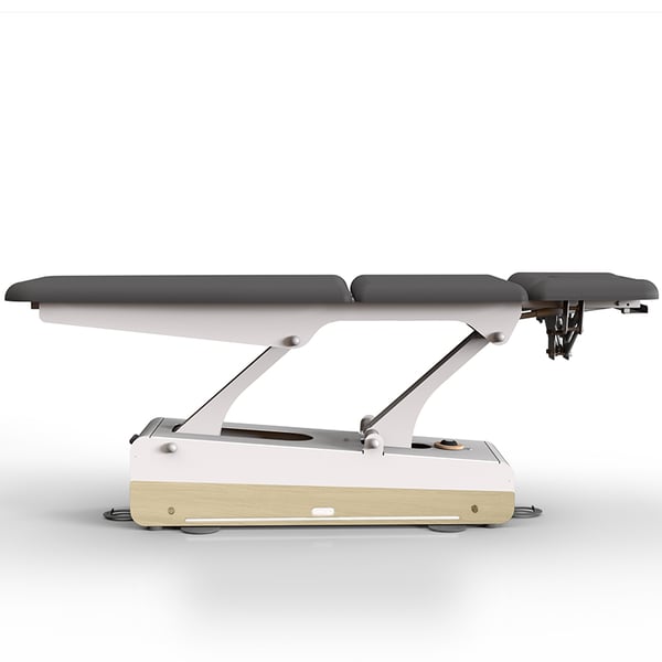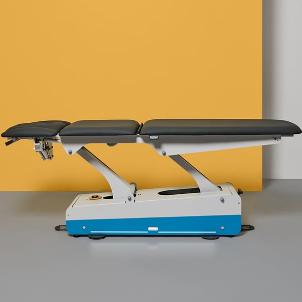 The table has five sections and a motorized center section , allowing for treatments with the patient completely recumbent or in a semi-recumbent position. It features an XL heated mattress , four 360-degree rotating wheels , and a lever-operated locking/unlocking system for easy movement.