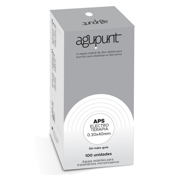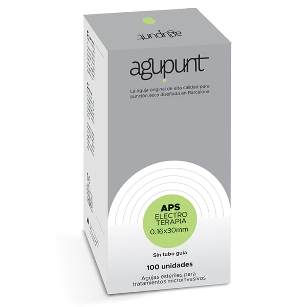 Agupunt Electrotherapy needles without guide tube . Needles specially designed for electrotherapy treatments, including the electrolysis technique . It has a greater conductance of the needle, facilitating the transit of electrons to the needle-degenerate tissue interface. It allows the action to be exclusively in the degenerated tissue avoiding any interaction with the adjacent healthy tissue. It offers greater visualization under ultrasound control , guaranteeing a correct application of the technique in the focus of the lesion. Likewise, it presents a greater concentration of electrons at the tip of the needle , guaranteeing a more intense electric field and, therefore, a greater electrochemical effect with less dose in the injured tissue. In addition, it has a better ability to penetrate the skin tissue with less pain.