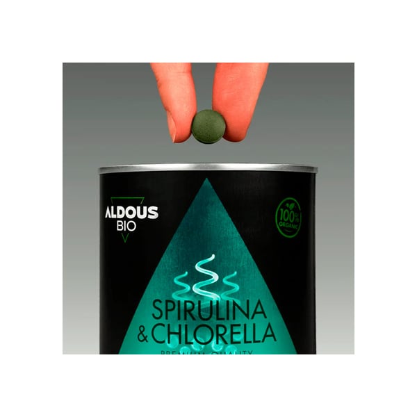 Aldous Bio Organic Spirulina and Chlorella Mix 600 tablets is an organic and natural food supplement that combines two of the world's most nutritious superfoods : spirulina and chlorella in a balanced proportion. This advanced formula provides high-quality plant proteins, vitamins, minerals, chlorophyll, and antioxidants , helping to strengthen the immune system, support the body's detoxification processes, and improve overall well-being in a synergistic way.