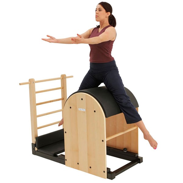 The Ladder Barrel is designed to challenge the abdominal and waist muscles and strengthen the spine while improving flexibility. The new Align-Pilates Barrel with Ladder features a revised frame and solid maple ladder for a classic look. Other improvements include a padded and upholstered top for added comfort, and the addition of wheels for easy movement.