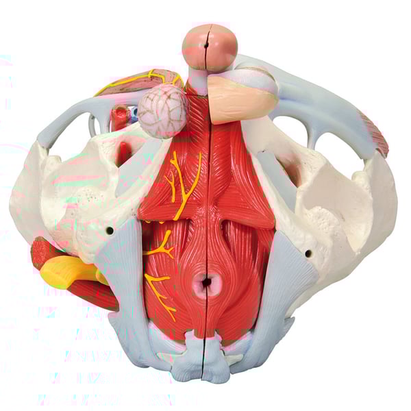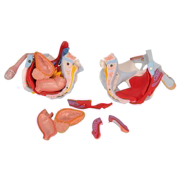 The seven-part male pelvis anatomical model shows us with great detail the spatial relationship of the bones, ligaments, vessels and nerves, as well as the pelvic floor musculature and the external organs of the male pelvis and gonads.