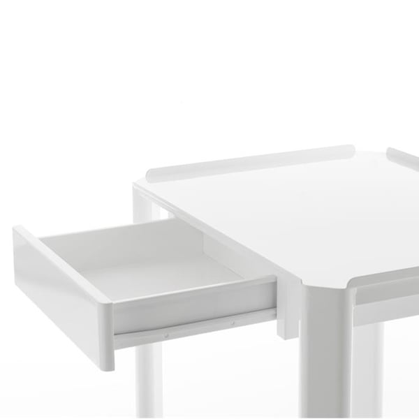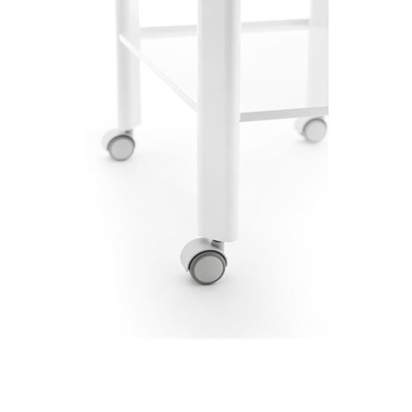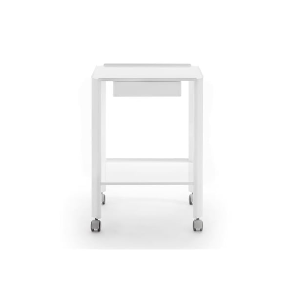 - It is a mobile table in enameled steel with 2 trays and a drawer at the front.