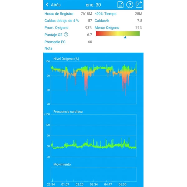 The BCOxygen Oxysleep is a modern and efficient pulse oximeter that allows to know the different data measured in real time both in the analyzer and in the smartphone , as well as to memorize the data continuously so that it can later be exported to the smartphone in a simple and fast way .