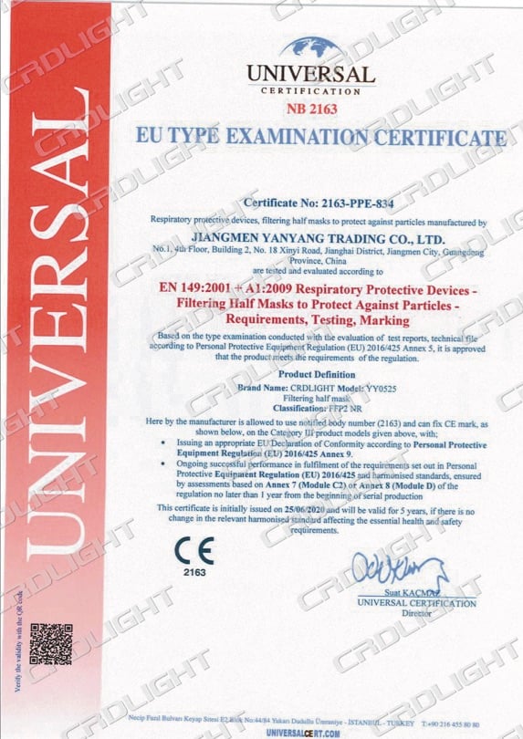- FFP2 NR protective self-filtering masks with European CE 2163 EN149: 2001 + A1: 2009 certificate.