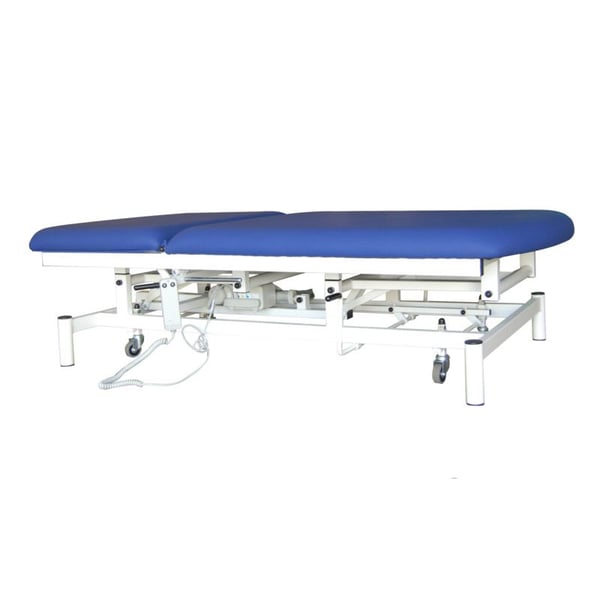 Bobath electric massage table with two sections. It has a reclining backrest and retractable wheels . Two sizes available: 190cm x 100cm or 200cm x 120cm