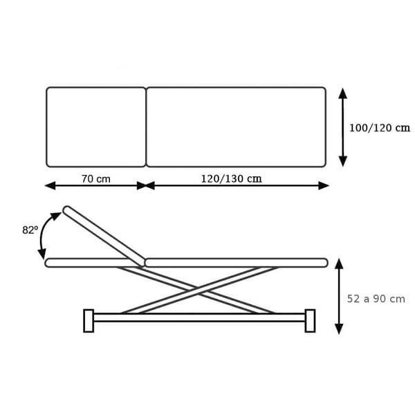 Bobath hydraulic stretcher with two sections, scissor type , with straight rise without lateral displacement and with retractable wheels . Two sizes available: 190cm x 100cm or 200cm x 120cm