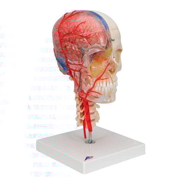 The new deluxe Bonelike didactic skull model clarifies all anatomical doubts. It gives the possibility of knowing structures in the transparent half of the skull and the bones in the bony half.