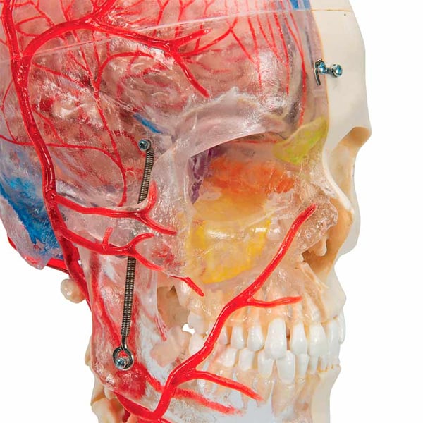 - The possibility of knowing the structures in the transparent half of the skull and the bones in the bony half, makes this skull of great didactic interest.