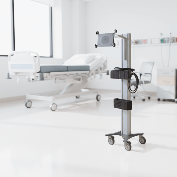 It incorporates a semi-flexible tablet arm, a silicone probe holder, a PVC basket, and 80 mm wheels, facilitating equipment organization and smooth movement between offices, hospitals, and clinics.