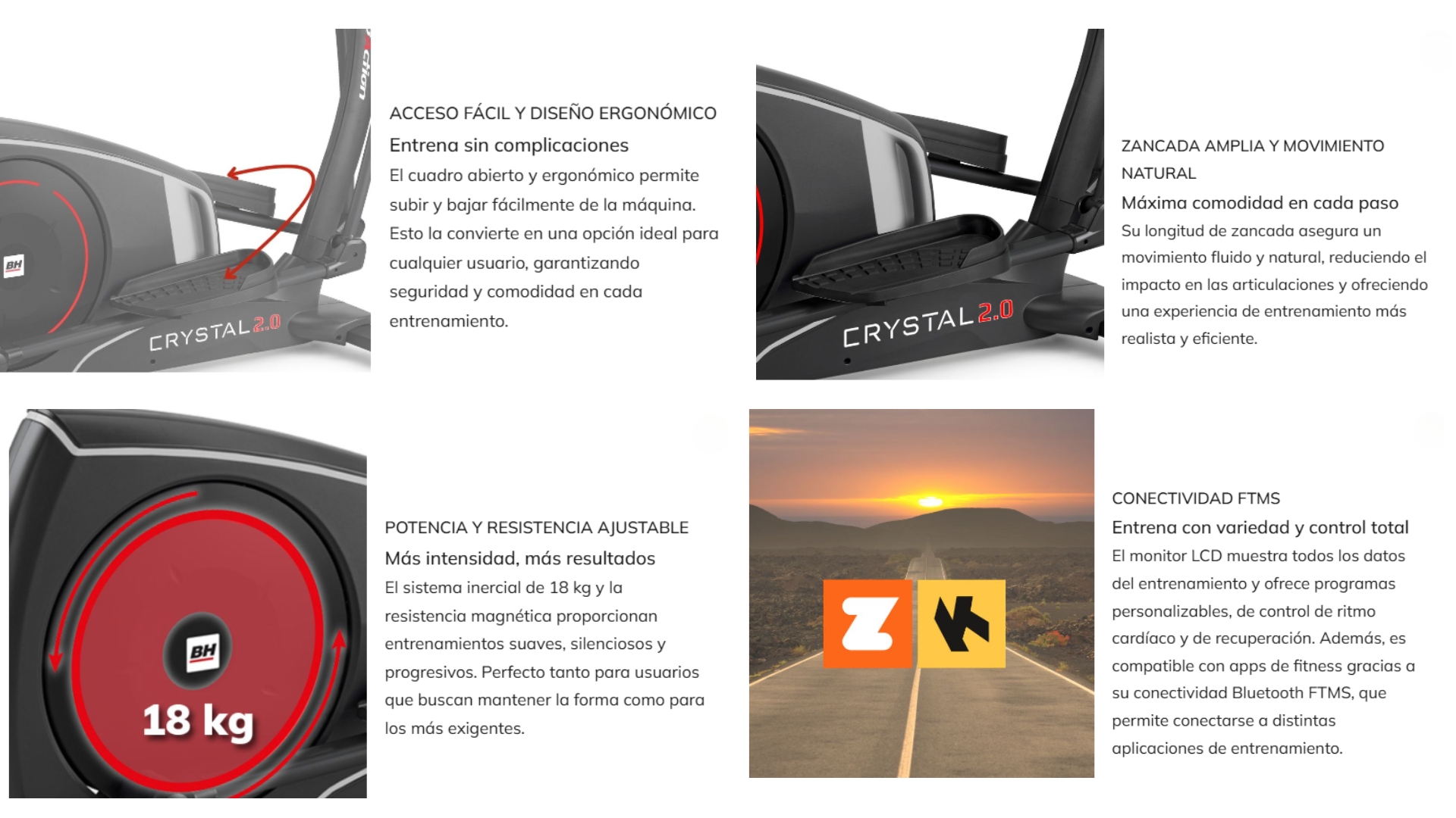The BH Fitness Crystal 2.0 G2383Ni is a modern, ergonomically designed elliptical trainer, ideal for intensive home workouts . It combines a smooth, natural motion with advanced training features and Bluetooth FTMS connectivity for use with fitness apps . Its easy-access structure and extra-large footrests allow for comfortable use by all types of users, while its magnetic resistance system and programmable monitor offer a complete and varied workout.