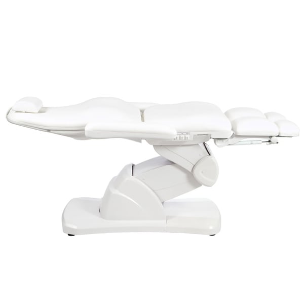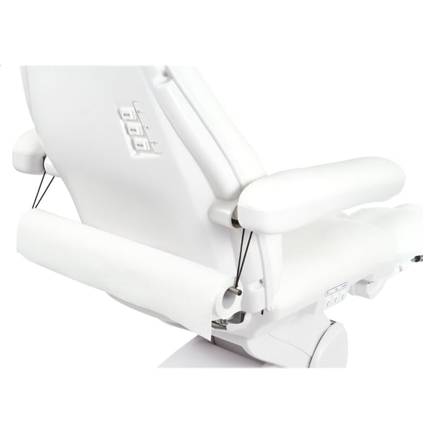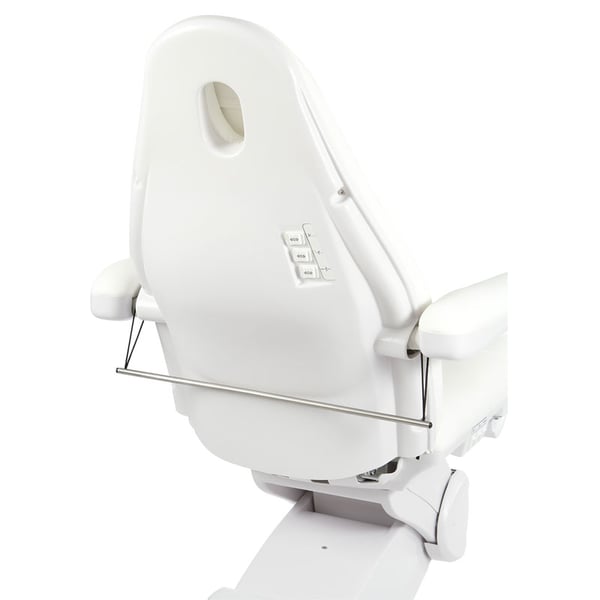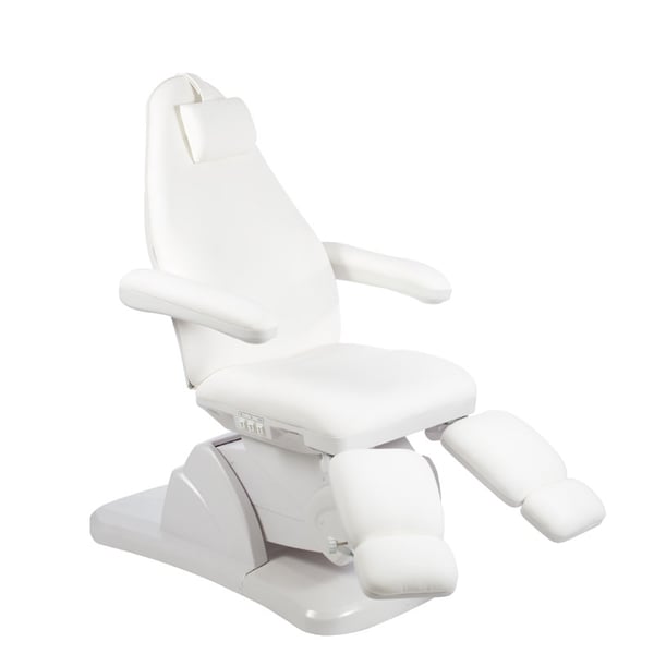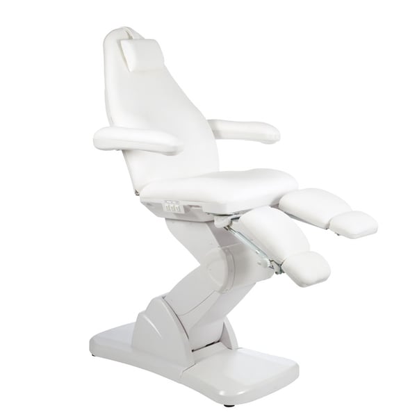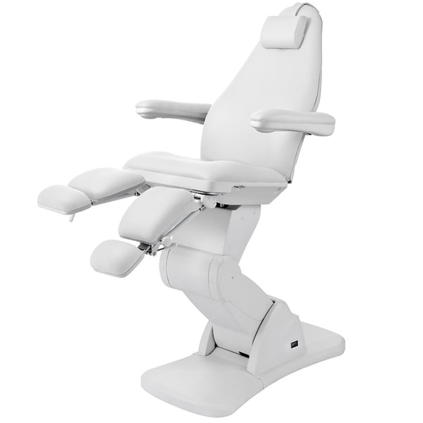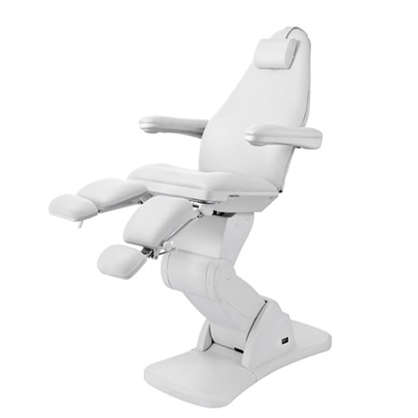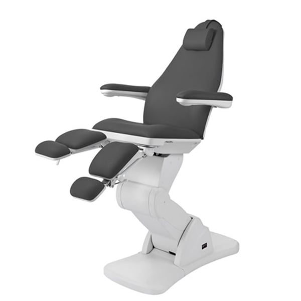High-end podiatry chair with a very stable structure equipped with three motors that control the height, backrest and seat inclination. It has folding armrests and a removable headrest cushion with a facial hole, independently adjustable footrests with a gas piston that regulates their height and with lateral opening up to 90°.