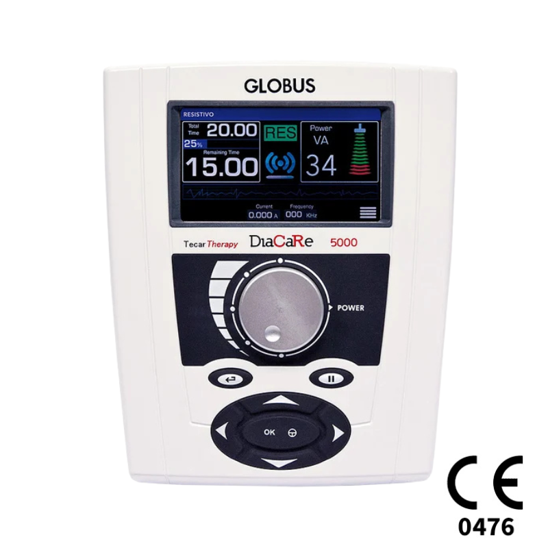 The Diacare 5000 is the portable device in the Globus Tecartherapy line and now offers new features. It boasts a wider frequency range and 14 established protocols . Key strengths include: automatic, pulsed, athermal, and transdermal treatments; automatic frequency scanning; and handpiece calibration.