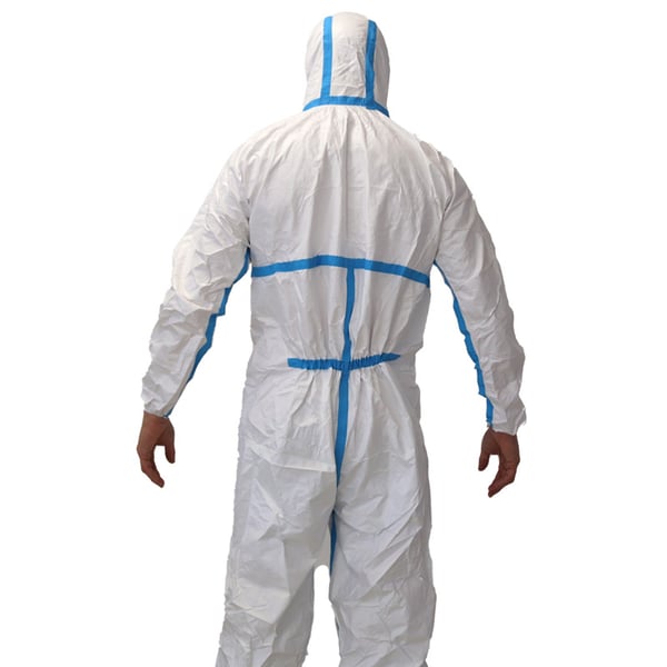 Disposable coverall with CE 2163 Certificate: Breathable material, front closure and elastic cuffs, hood and ankles.