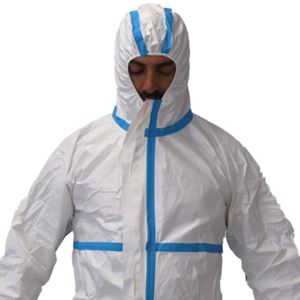 Disposable coverall with elastic cuffs, hood and ankles. Front closure with zipper covered with white polyester adhesive protective flap. Breathable material to help reduce heat build-up and promote comfortable wear. Protective overalls are designed to protect against hazardous substances or sensitive products and processes from contamination by third parties.