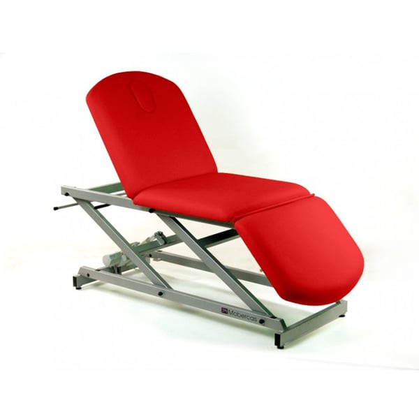 Economic electric stretcher with three sections, armchair type, with toilet roll holder and face cap. It offers the possibility of adding retractable wheels. Specially designed for physiotherapy and rehabilitation treatments .
