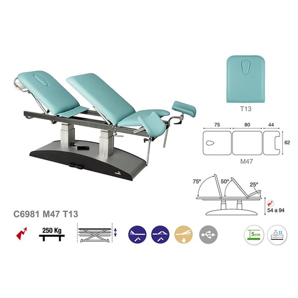 Ecopostural electric stretcher: Specialized in gynecology and examination, with leg rests and three bodies (62x200 cm)