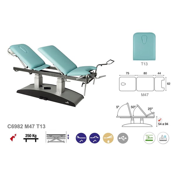 Ecopostural electric stretcher: Specialized in gynecology and examination, with stirrups and three bodies (62x200 cm)
