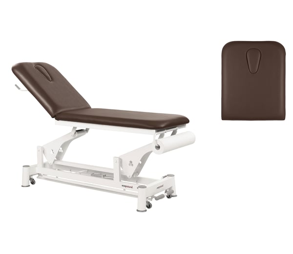 New, modern and versatile two-body Ecopostural stretcher with electric lifting system and white connecting rod structure. It consists of an oscillating headrest, facial plug , foam padding of various degrees of firmness and class M2 upholstery. It also has a steel connecting rod structure with bearings and retractable wheels that make it easier to move it sideways .