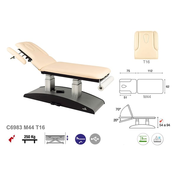Electric stretcher with vertical elevation, two columns, two bodies and headrest that can be tilted up to 90º. It also has a roll holder included. It has a simple, modern and functional design. Another of the great advantages that the stretcher offers is its versatility, as it is ideal for numerous fields: physiotherapy, osteopathy, general medicine, aesthetics, tattoos. A perfect solution for any health and beauty professional.
