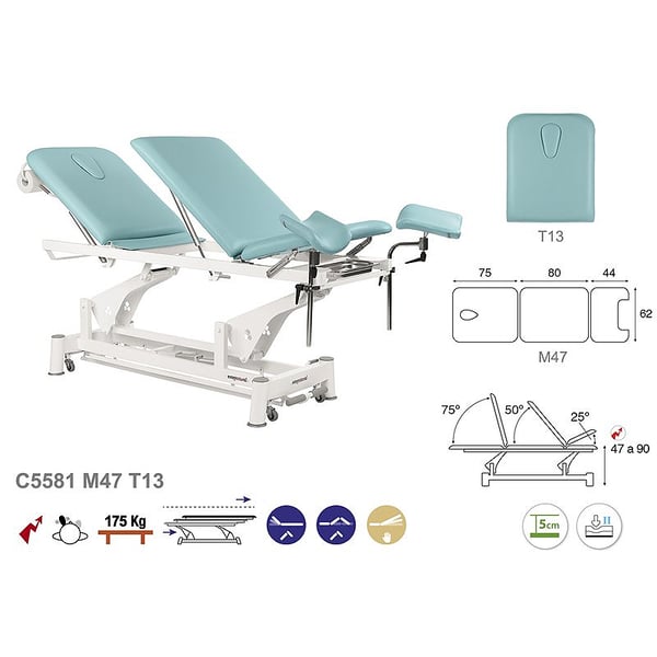 Electric stretcher specialising in gynaecology and examination with two columns, three sections and leg rests included. It has a simple, modern and functional design. Another of the great advantages of the stretcher is its versatility, as it is ideal for numerous fields: physiotherapy, osteopathy, general medicine, aesthetics, tattoos. A perfect solution for any health and aesthetics professional.
