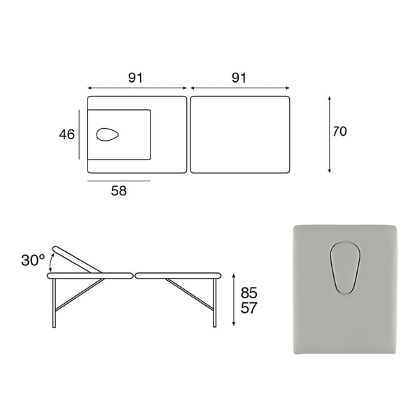 New professional two-section folding Ecopostural stretcher , ideal for any type of treatment. It consists of an adjustable headrest and a natural wood structure. It also has an oscillating headrest and a face plug for greater comfort. It also has foam padding of various thicknesses and M2 class upholstery.