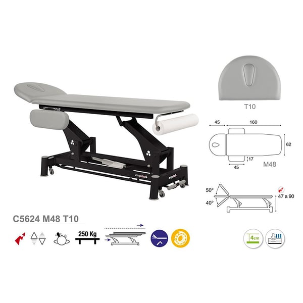 Ecopostural technical electric stretcher: two bodies with folding arms, black connecting rod structure and T10 head (62 x 207 cm)
