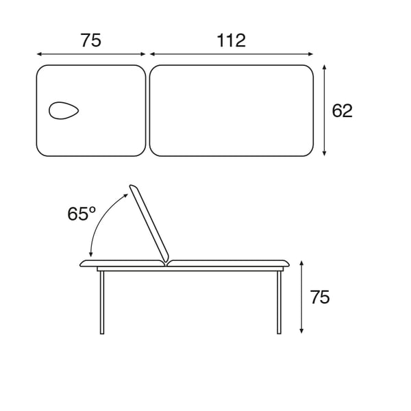 New Ecopostural fixed stretcher, with two bodies and two sections . It consists of a structure made of steel coated with white paint and a reclining backrest with a rack system, as well as removable legs , which make the stretcher easier to transport and handle. In addition, it has an oscillating headrest with a face plug, foam padding of different thicknesses and M2 class upholstery.
