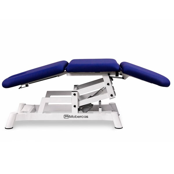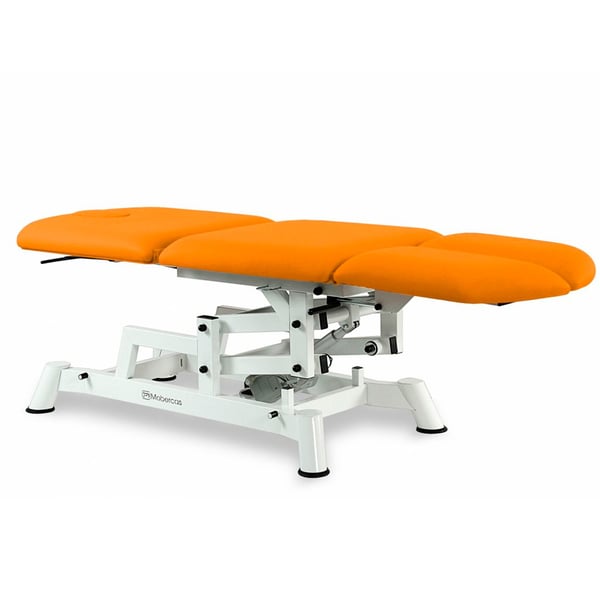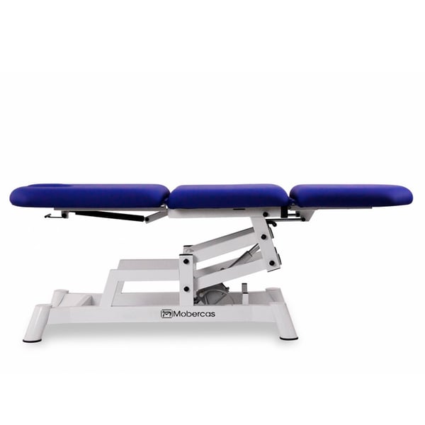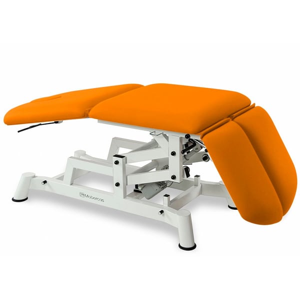 Three-section electric stretcher -style chair with height adjustment and a face shield . It features a practical and functional design with an electric motor for height adjustment via a handheld control. It also comes with independent, adjustable and reclining leg rests for added comfort. Ideal for podiatry treatments.
