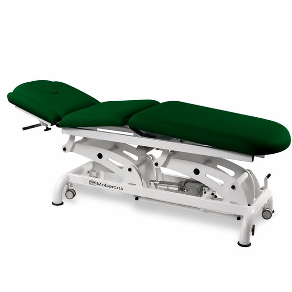 Electric couch for osteopathy: three bodies, with height adjustment, negative reclining backrest, Trendelenburg, roll holder and retractable wheels (two models available)