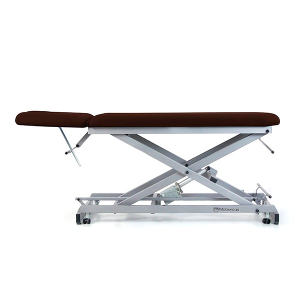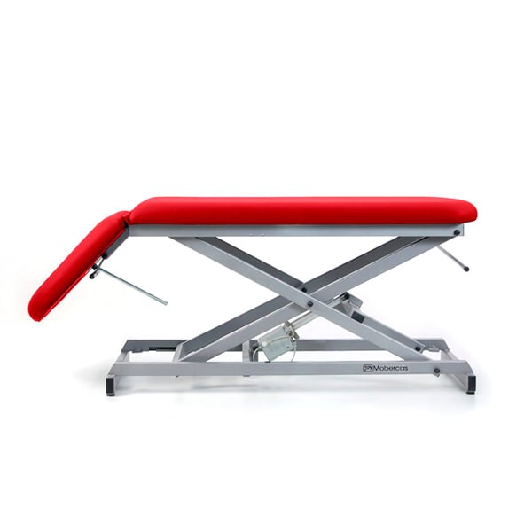 Electric two-body examination stretcher with straight rise without lateral movement, with roll holder, facial cap. Available with the option of retractable wheels.