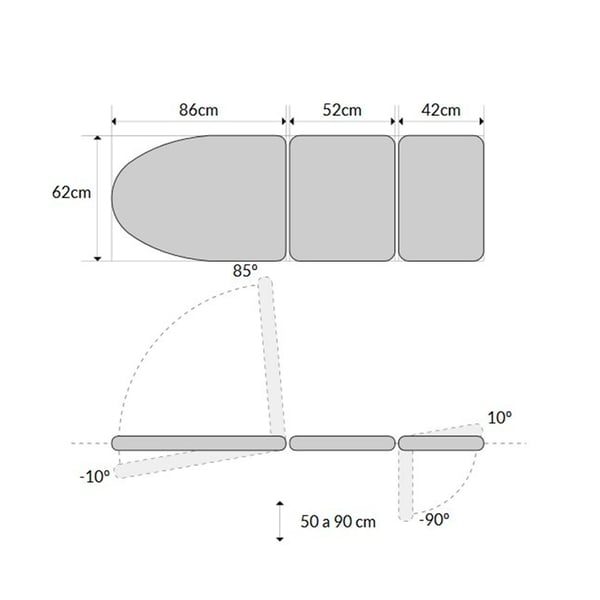 - Arms: folding armrests 90º, 180º horizontally (metallic and upholstered)