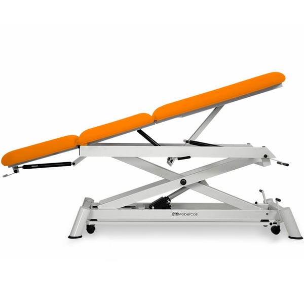 Three-section electric osteopathy stretcher, with negative reclining backrest, central fold and straight rise without lateral movement. Includes face cap and retractable wheels . It consists of a Trendelenburg position using two gas pistons.