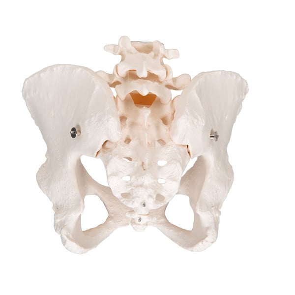 Anatomical model of the skeleton of the female pelvis consisting of the hip bones, the sacrum with coccyx and two lumbar discs with movable symphysis