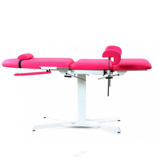 Gynecology chair with three sections and fixed height . It includes gynecological leg supports, a removable stainless steel tray, folding armrests to facilitate lateral access and an ergonomic neck cushion .