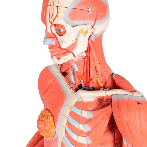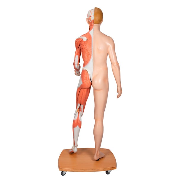 For this reason, it is a teaching material of great value for higher medical schools. The right half shows the skin and the left half shows the superficial and deep musculature with nerves, vessels and bone structures.