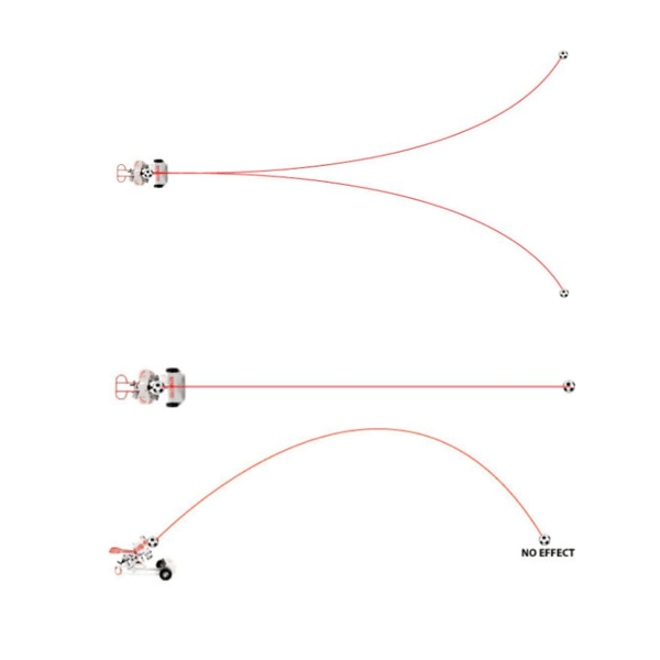 Curved effect : a curved launch is obtained by keeping the two shooting wheels at the same level, and adjusting them to different speeds. The ball will rotate around its vertical axis and have a curved path.