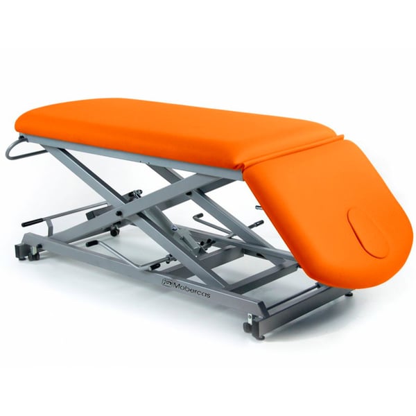 Hydraulic examination stretcher of two bodies. It has a negative reclining backrest and straight rise without lateral displacement, with a toilet paper holder and a facial cap . Available with retractable wheels option .