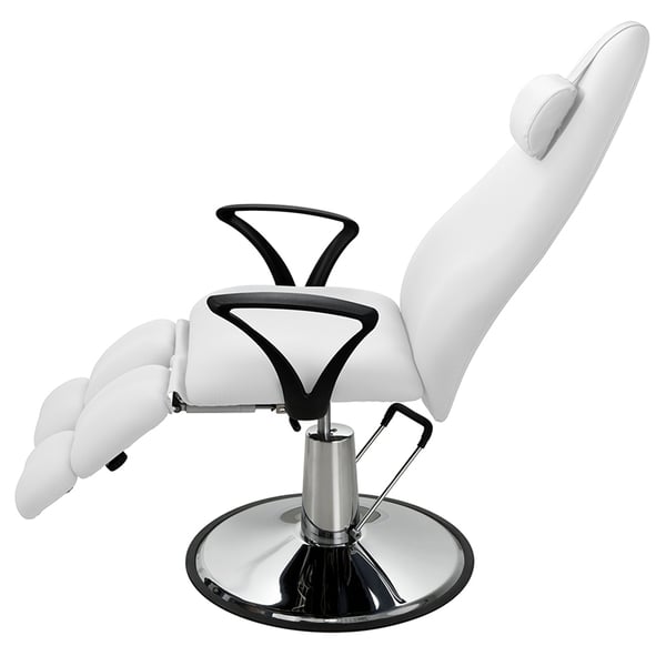 Rotating podiatry chair with adjustable height by hydraulic pump, backrest and footrest independently adjustable by gas piston.