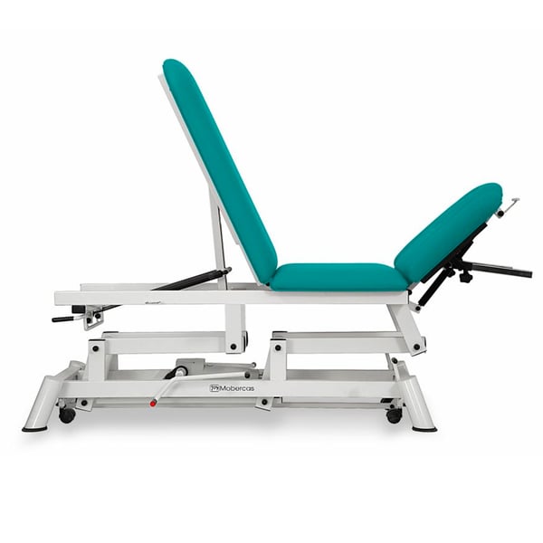 Hydraulic stretcher for osteopathy: five bodies, with negative reclining backrest, adjustable armrests and retractable wheels