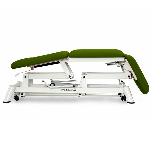 Hydraulic stretcher, chair type, with three bodies. It has motorized height adjustment, independent lifting/reclining legs, face cap and retractable wheels.