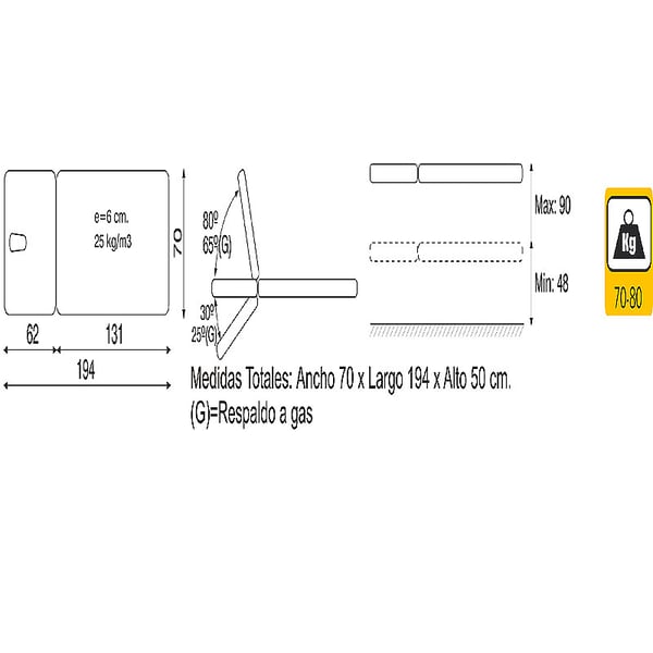 - Measurements: 194 cm x 70 cm x (48 - 90cm).