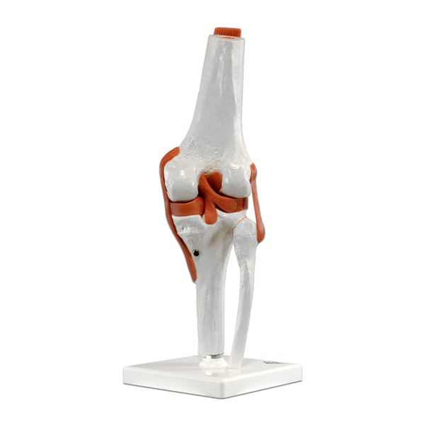 This high-quality, life-size functional model of the right knee joint with ligaments represents the anatomy and physiological movement possibilities in extraordinary detail. The coloration of the bones molded according to their original is extremely realistic. The cartilage on the articular surfaces is represented in blue. The model consists of the thigh, tibia and fibula stumps, the menisci and the patella .