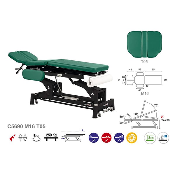 Multifunctional Ecopostural electric stretcher: three bodies with black connecting rod structure, folding arms and T05 head (50 x 198 cm)