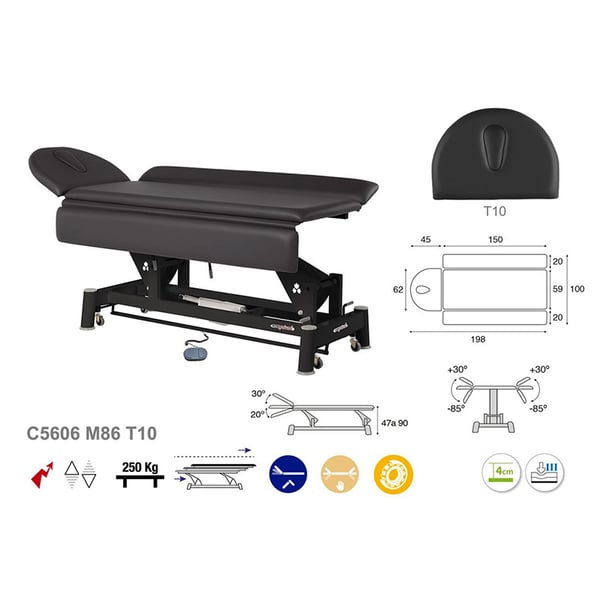 Multifunctional Ecopostural electric stretcher: two bodies, Bobath type, with folding arms, black connecting rod structure and T10 head (100 x 198 cm)