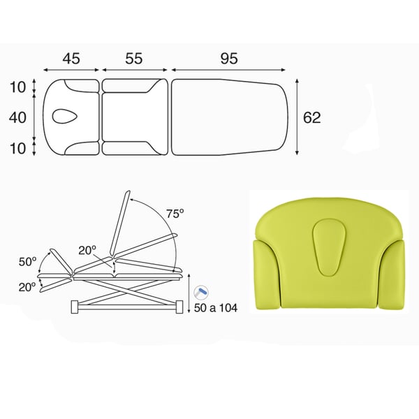 - Reclining bodies by means of: Head part by gas spring, kyphosis part by gas spring, foot part by gas spring.