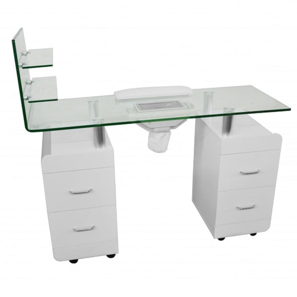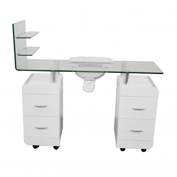 Elegant white plywood manicure table with vacuum cleaner, bag and palm rest cushion. Tempered glass top and shelves. Equipped with a double column with drawers and wheels included . It incorporates practical features such as a vacuum cleaner, bag and hand rest cushion.