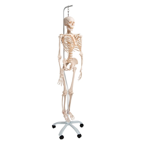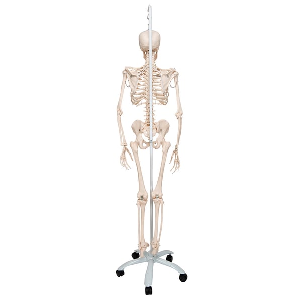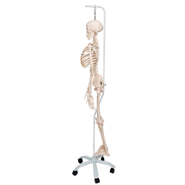 The hand bones in this skeleton model have been mounted on wires to allow them to be viewed in their natural position. The flexible mounting of the foot bones only serves for your mobility. The shoulder blades rotate when the arms are raised . Even low mobility of the sacrum and pelvis can be demonstrated with this model.