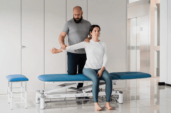 Electric physiotherapy table with two sections, featuring a reclining backrest and adjustable height via an electric motor . Recommended for therapy, massage, and medical examinations. Includes a towel rack.