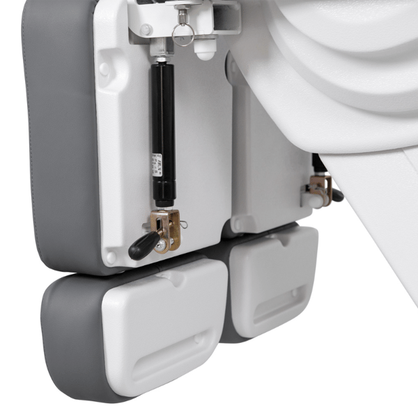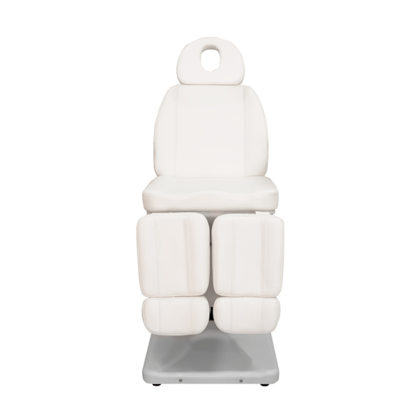 The footrests are independent and adjustable by gas piston, while the armrests are foldable and the adjustable headrest includes a face hole, ideal for aesthetic or wellness treatments.
